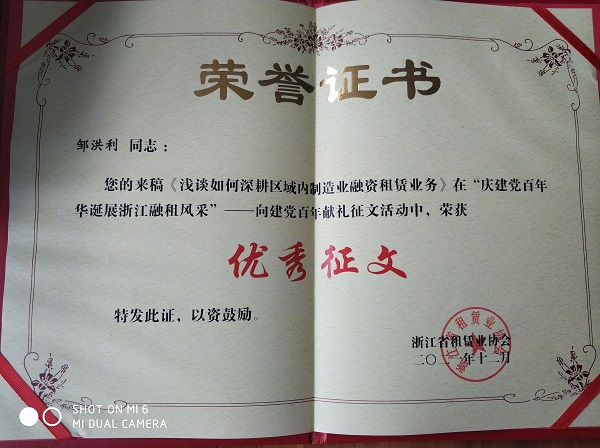 同时,浙江台金融资租赁有限公司选送参加“庆建党百年华诞展浙江融租风采”向建党百年献礼征文活动的文章——《浅谈如何深耕区域内制造业融资租赁业务》,在各类选送作品中脱颖而出,入选“优秀征文”名单。