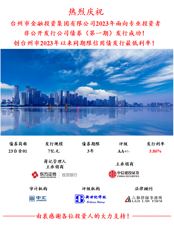 面对一季度流动性趋紧、利率上行的压力,betway西汉姆联官网精准把握4月份发行时机,“早发、抢发、快发”,将有效发行窗口“用足、用好、用尽”,在承销机构及各投资人的大力支持下,23台金01最终发行利率为3.86%,认购倍率1.77,创台州市2023年以来同期限信用债发行最低利率。