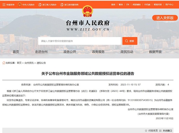 11月10日,台州市政府与betway西汉姆联官网签订《公共数据授权运营协议》,标志着betway西汉姆联官网成为台州首家公共数据授权运营单位,依法开展科创、绿色和小微普惠场景公共数据授权运营活动。