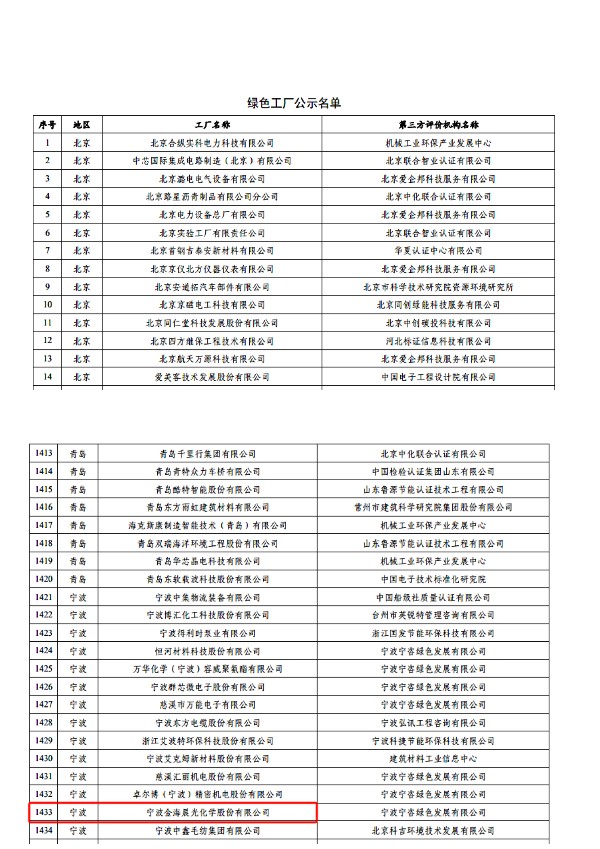 工信部日前公示2023年度国家绿色制造名单,宁波金海晨光化学股份有限公司(以下简称:金海晨光)入选国家级“绿色工厂”公示名单。绿色制造体系是针对符合科学“绿色发展”倡导的企业给出的一种认定,目的是深入实施绿色制造工程,加快构建绿色制造体系,发挥绿色制造先进典型的示范带动作用,从而实现产业全面升级和优化。而国家级“绿色工厂”则是绿色发展荣誉的“天花板”,由县、市、省各级工信部门按照“优中选优、宁缺毋滥”的原则层层选拔推荐。