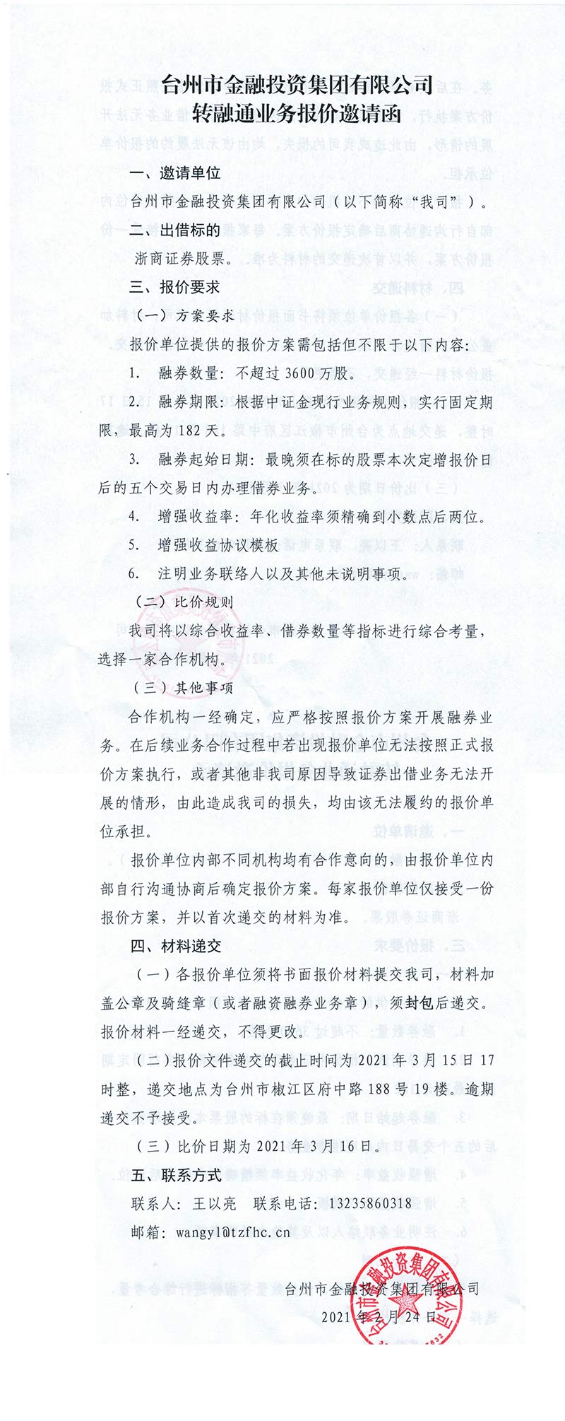 台州市金融投资集团转融通业务报价邀请函(浙商证券股票报价)