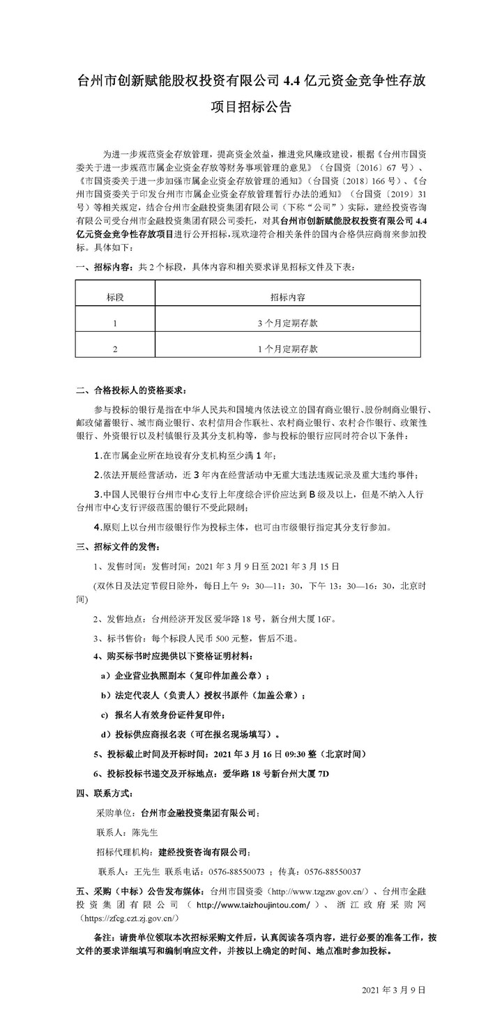 台州市创新赋能股权投资有限公司4.4亿元资金竞争性存放项目招标公告