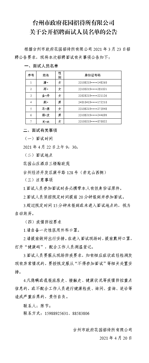 台州市政府花园招待所有限公司关于公开招聘面试人员名单的公告