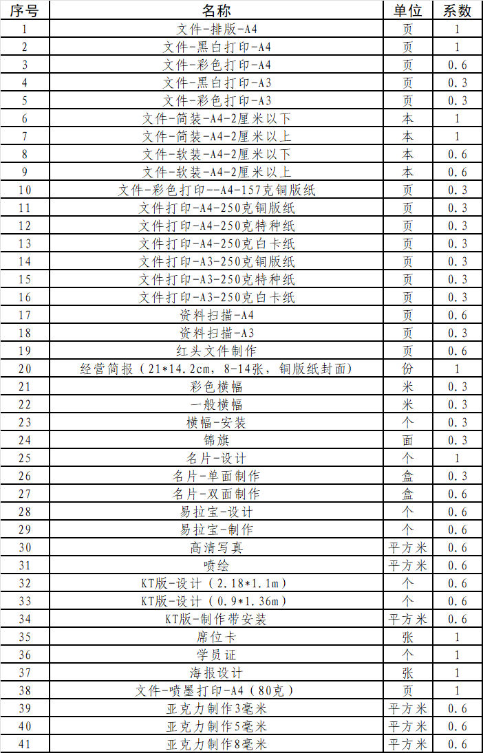 1.采购内容:选择一家文印服务商签订服务协议,原则上服务期限不超过2年,每年续签一次,若出现服务不到位的情况,公司有权重新采购或终止服务。文印服务包括但不限于下列清单。