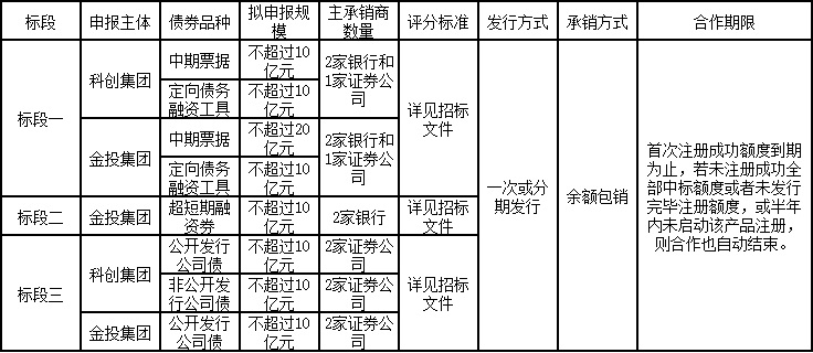 发行债券主体为科创集团和金投集团。共分为三个标段,通过公开招投标形式评选承销商,总共采购6家银行,6-8家证券公司,标段一共计采购4家银行和2家证券公司,标段二共计采购2家银行,标段三共计采购6家证券公司,具体见下表: